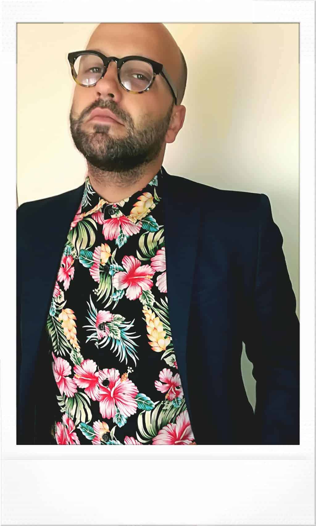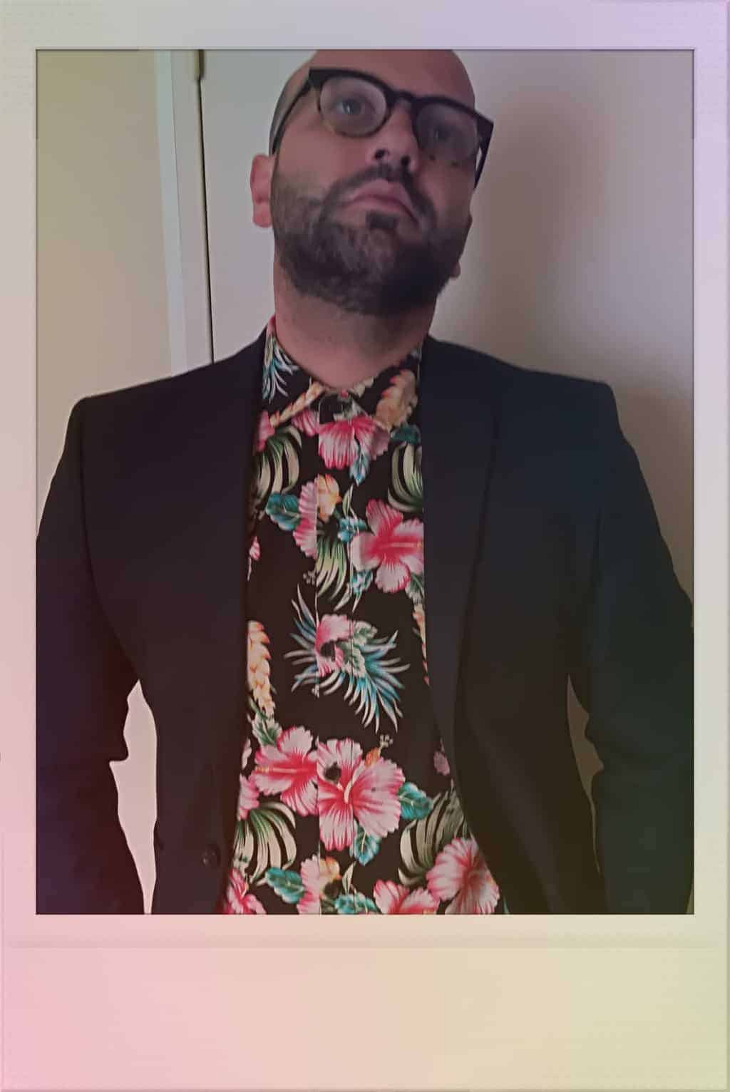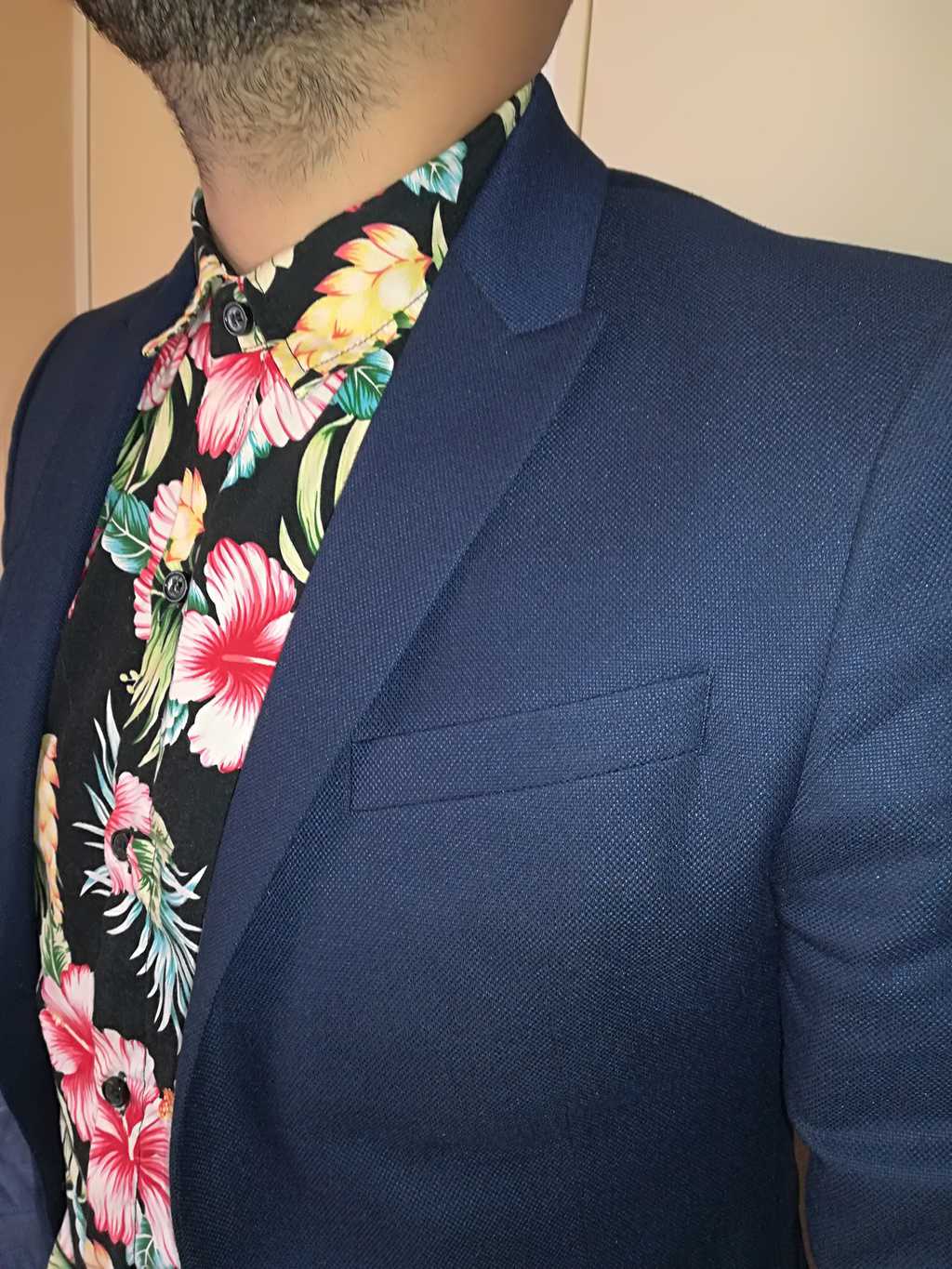 Un look masculin parfait : le mix chemise fleurie veste pour une journée de travail en total look casual chic.