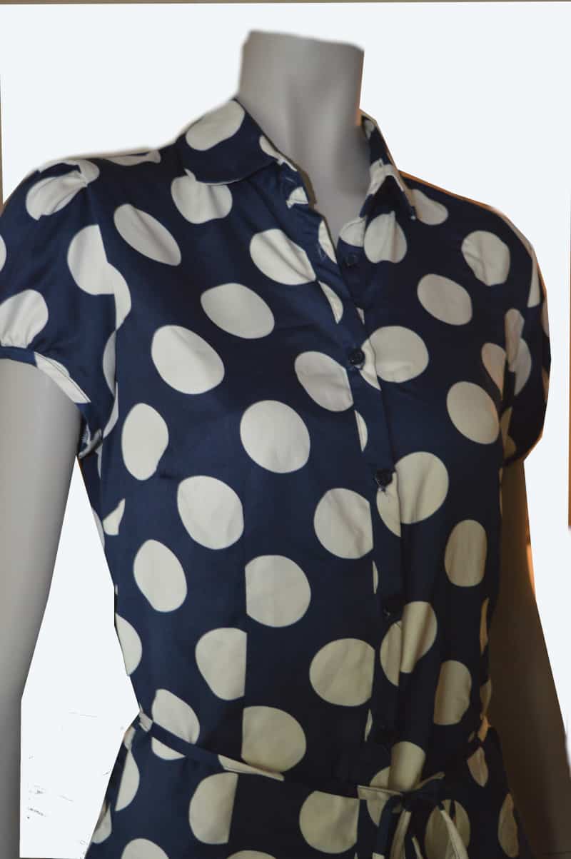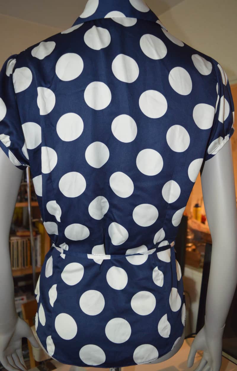 Corsage cintré avec col claudine, petites manches ballons et ceinture.