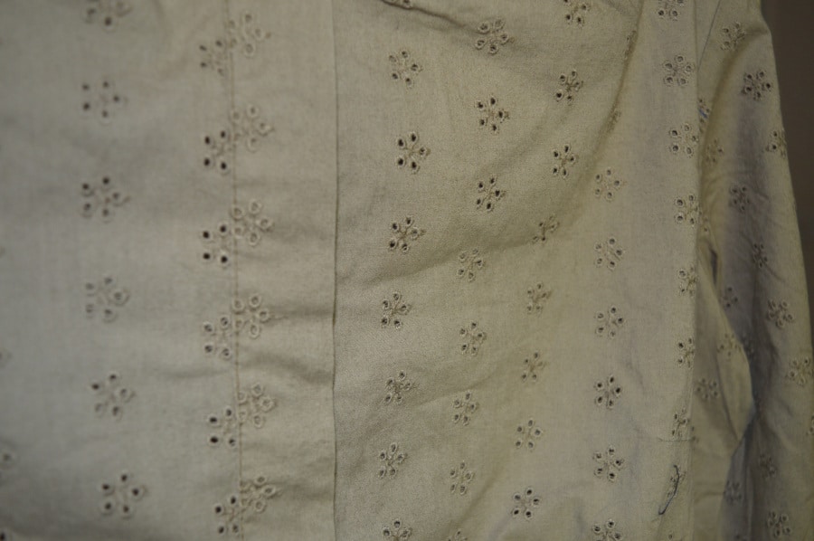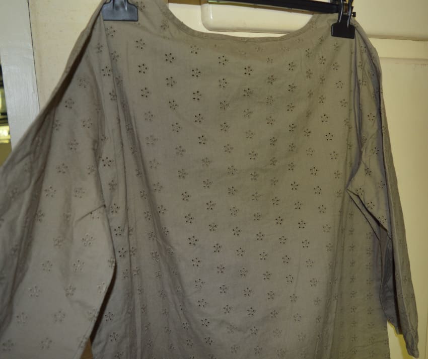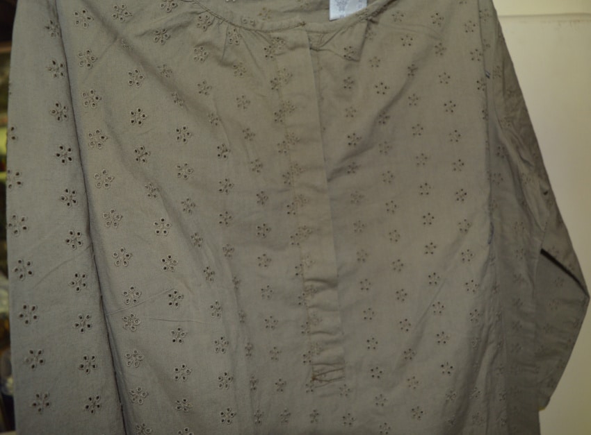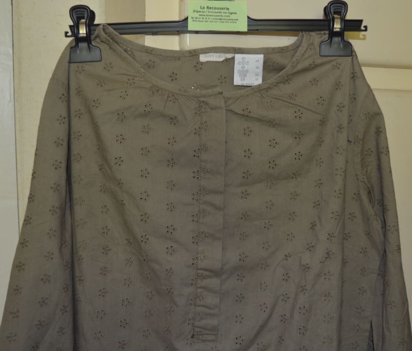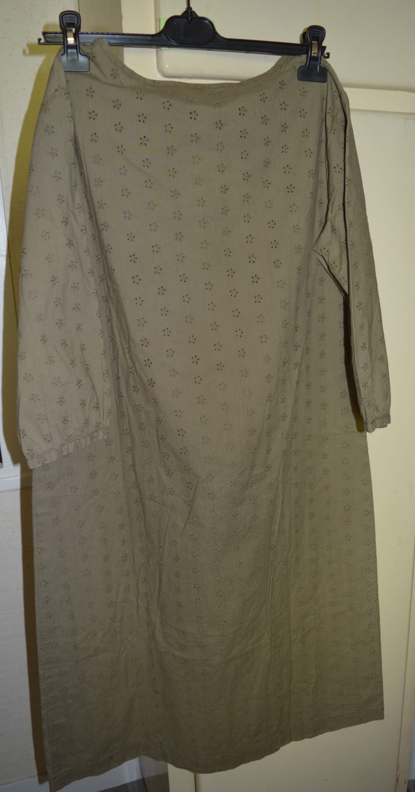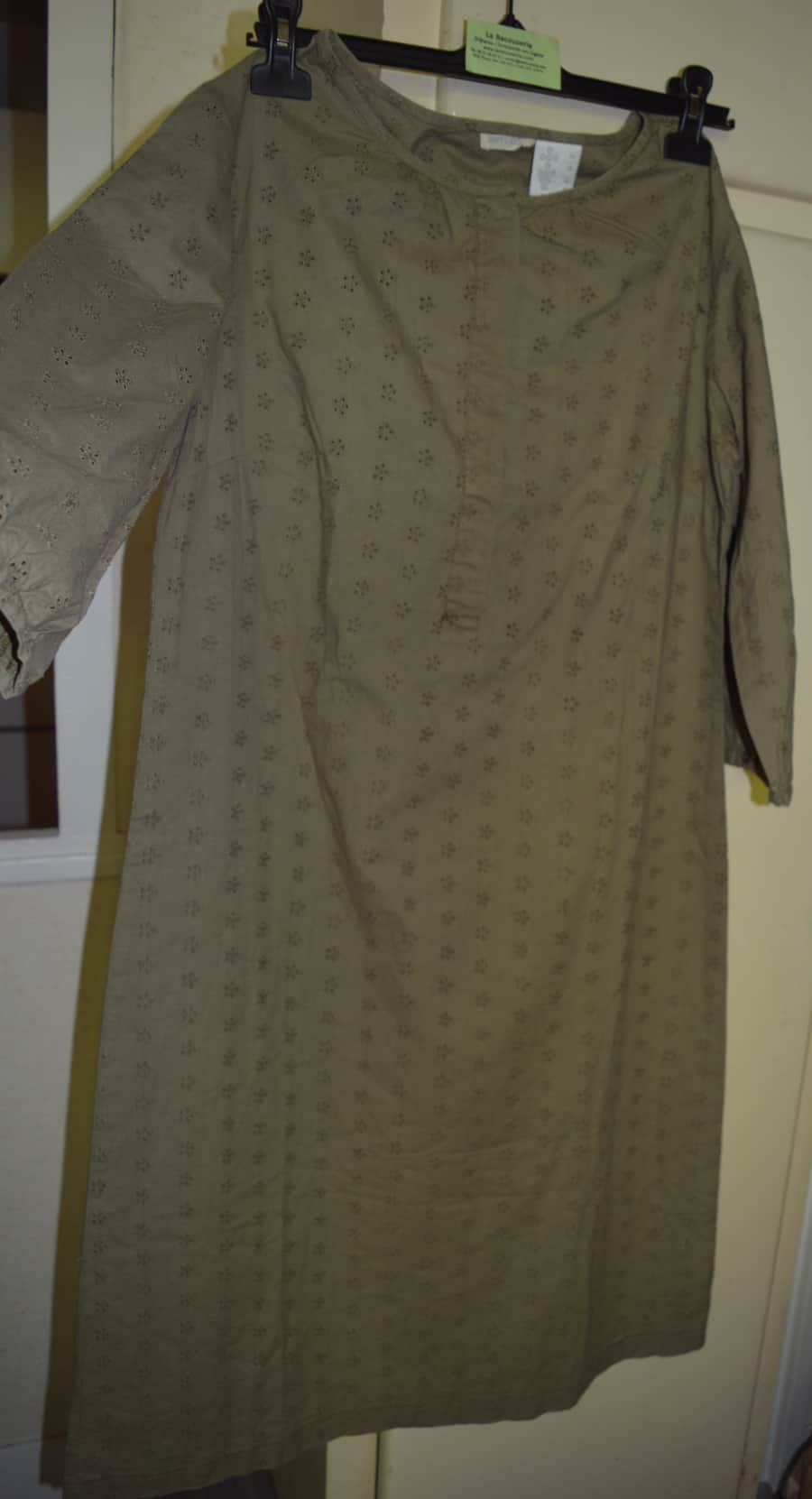 Irrésistible avec ses broderies anglaises dans un coton kaki, cette robe avec une coupe droite avec ses manches 3 quarts ira avec tout, sandales, baskets, perfecto, châle…