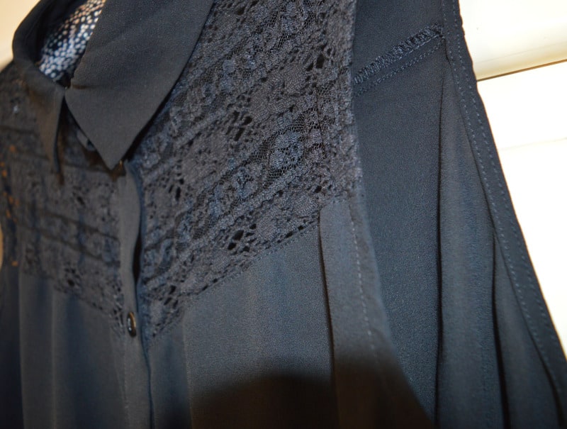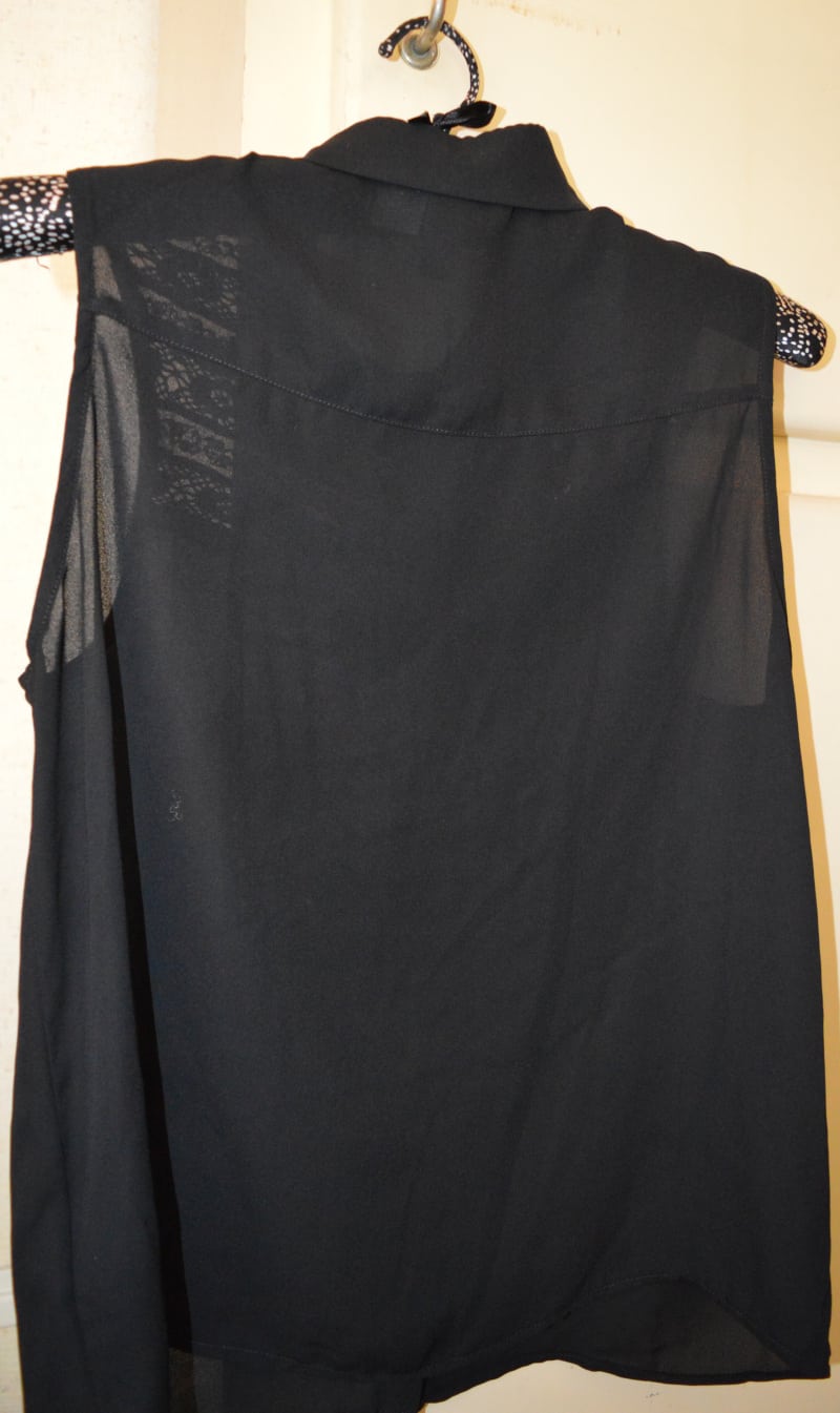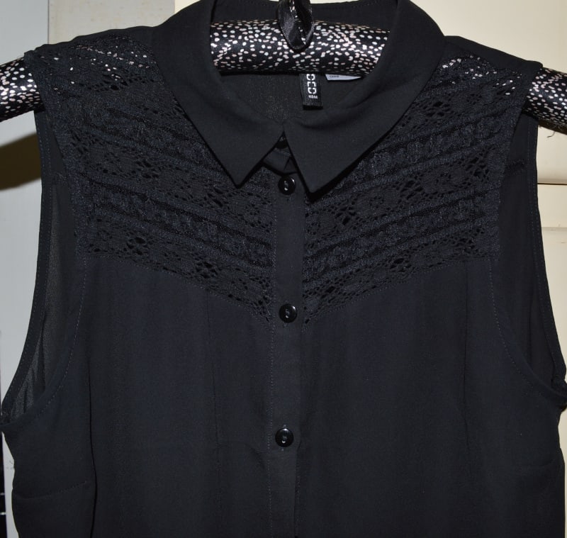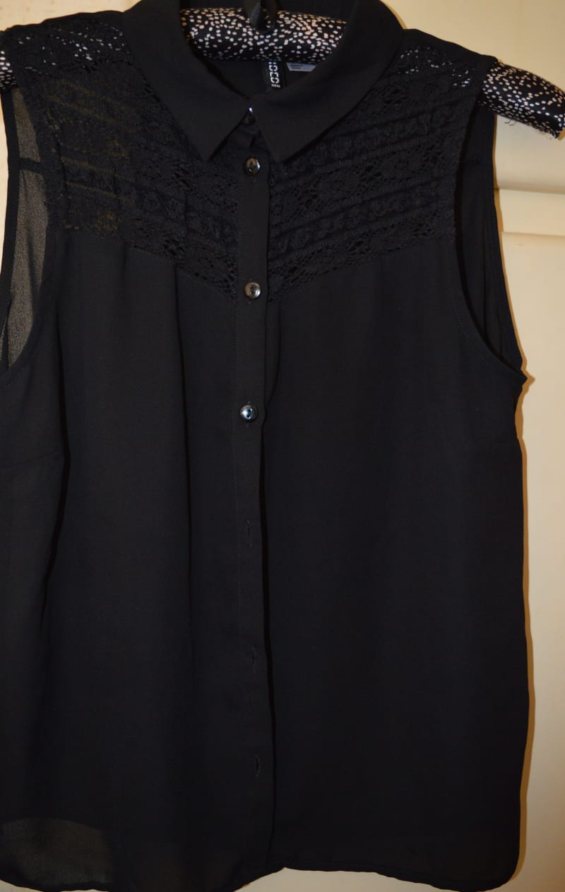 Top sans manches boutonné avec incrustation de dentelle sur le devant.